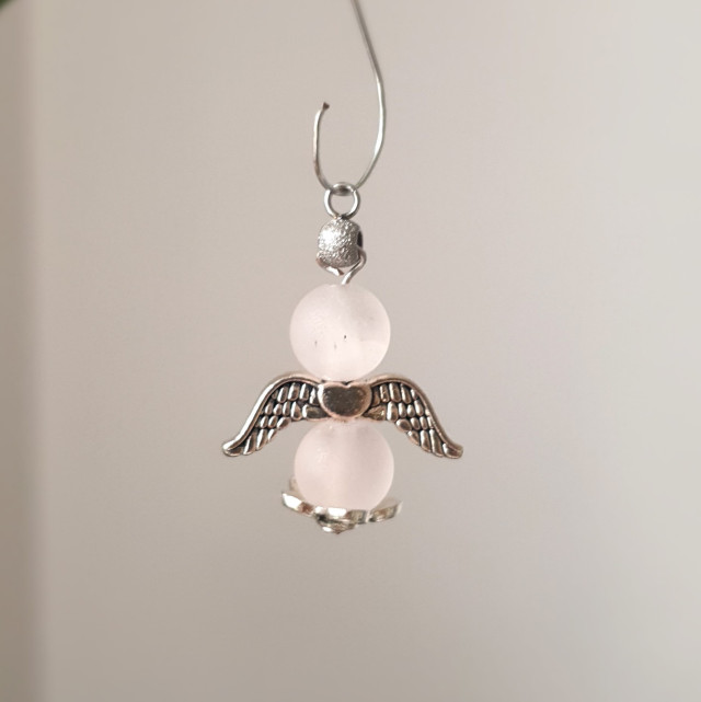 This pendant is made 8 mm rose quartz crystals and silver metalic angel wings.
