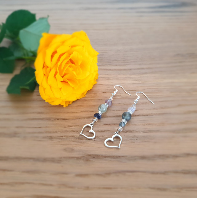This earring is made of 4 mm clear quartz and 8 mm fluorite crystals and a heart shape hanger.