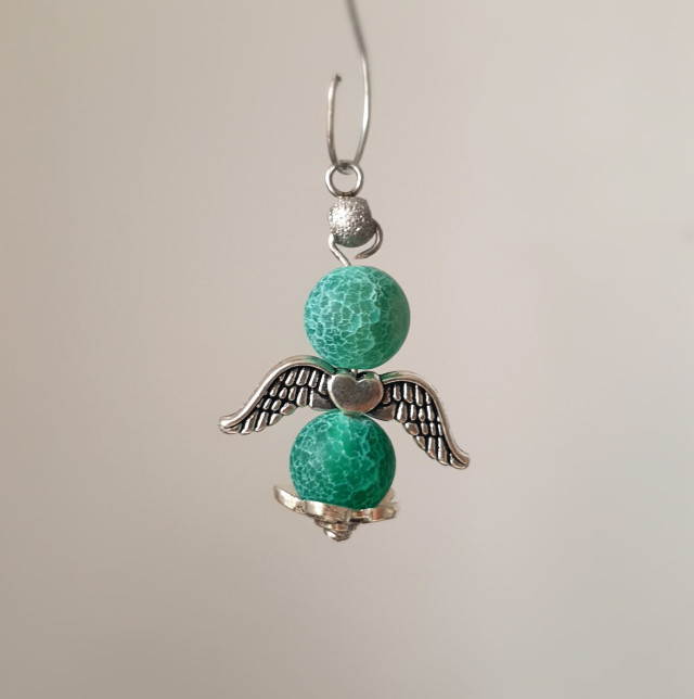 This pendant is made 8 mm green colored agate crystals and silver metalic angel wings.