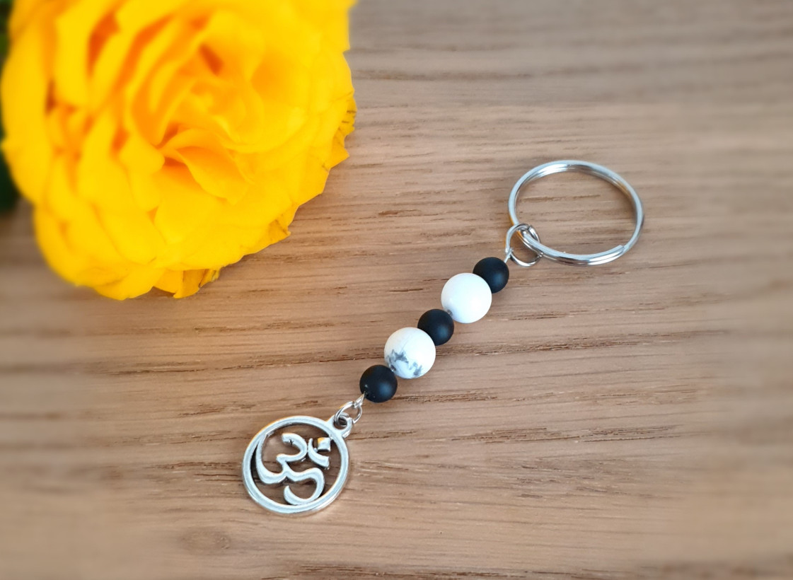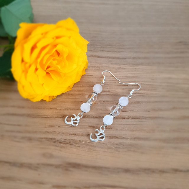 This earring is made of 8 mm clear quartz and rose quartz crystals and a hanger with the "OM" symbol.