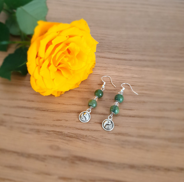 This earring is made of 4 mm clear quartz and 6 mm jade crystals and a Yin-Yang hanger.