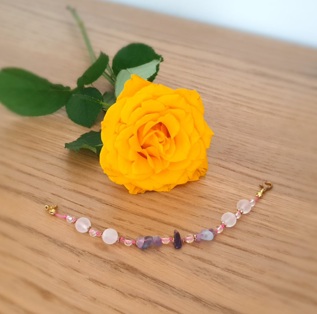 This bracelet is made of 4 mm clear quartz and 8 mm rose quartz crystals and fluorite splitters. It has golden color clasp and
