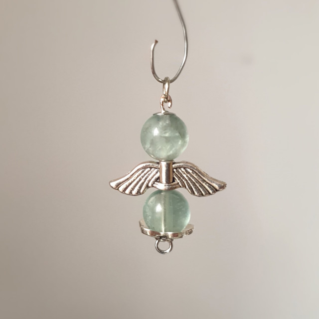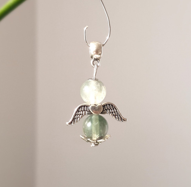 This pendant is made 8 mm fluorite crystals and silver metalic angel wings.