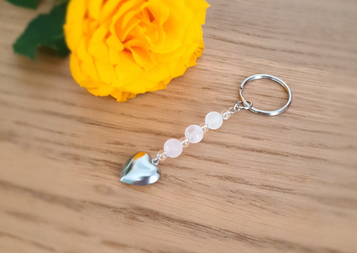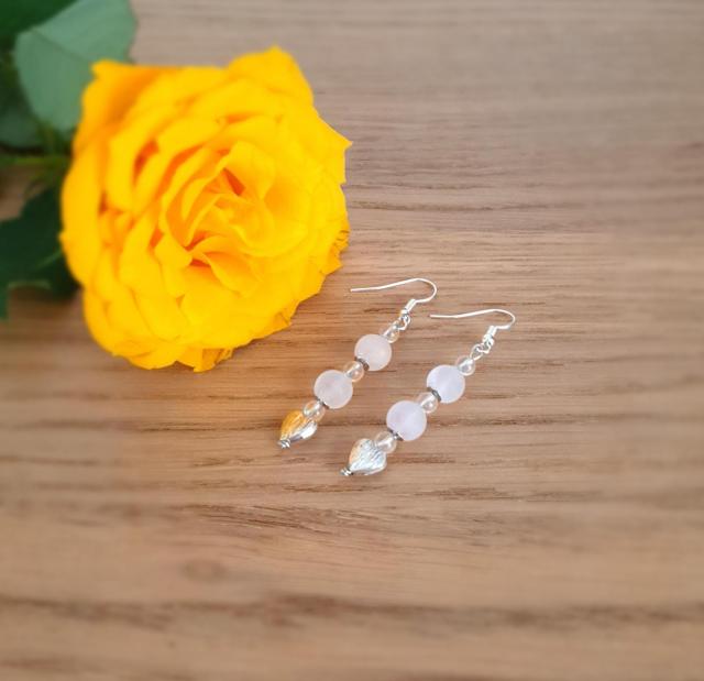 This earring is made of 4 mm clear quartz and 8 mm rose quartz crystals and a heart shape metal pearls.