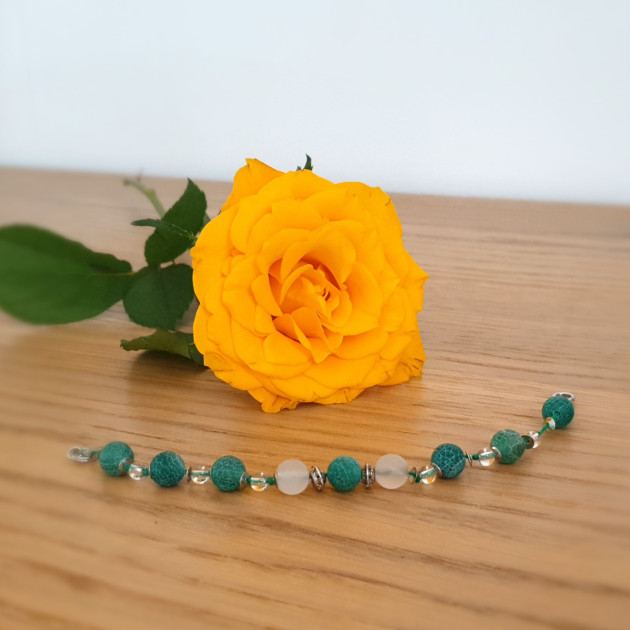 This bracelet is made of 4 mm clear quartz and 8 mm rose quartz and green colored agatecrystals. It has silver color clasp and metal pearls.