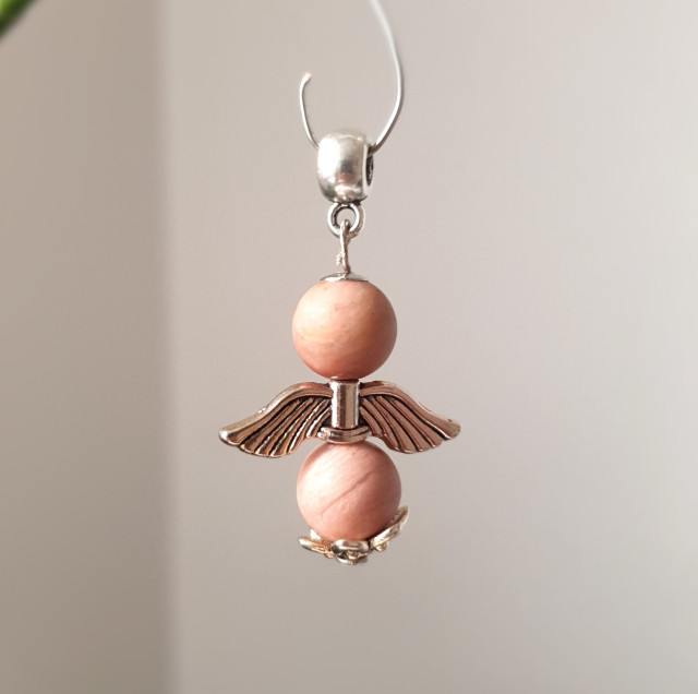 This pendant is made 8 mm rose quartz crystals and silver metalic angel wings.